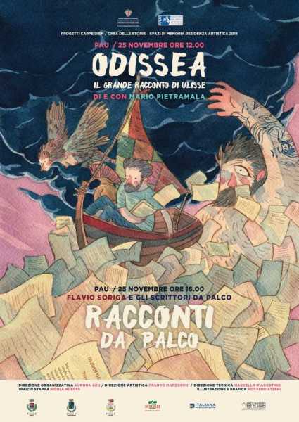 PAU. Nuovo tappa a Pau per le residenze artistiche e gli spettacoli di Progetti Carpe Diem, la struttura diretta da Franco Marzocchi e Aurora Aru che nell’ambito del progetto Spazi di memoria presenta una giornata dedicata alle letture, tra incursioni nei classici e spaccati di contemporaneità. Doppio appuntamento aperto al pubblico domenica 25 novembre a Casa Cauli: al mattino va in scena Odissea – Il grande racconto di Ulisse, di e con Mario Pietramala, con sipario alle 12; mentre al pomeriggio spazio a Racconti da palco, il reading del collettivo di autori Scrittori da palco guidato da Flavio Soriga, con inizio alle 16.