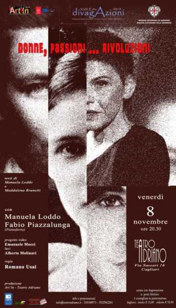 CAGLIARI. Venerdì 8 novembre alle 20.30 per la diciassettesimaedizione della rassegna “DivAgazioni”, a cura dell’associazione Art’in, al Teatro Adriano andrà in scena ““Donne, passioni…rivoluzioni”, scritto dall’attrice Manuela Loddo e dalla giornalista Maddalena Brunetti, con la regia di Romano Usai.