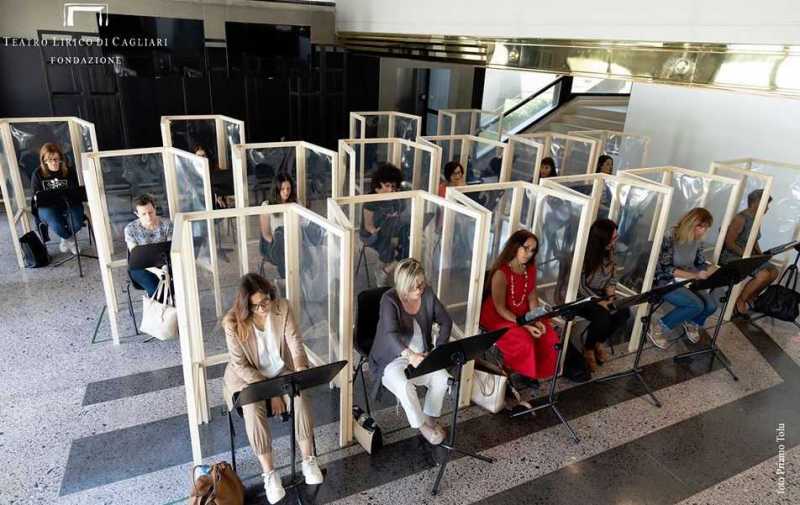 CAGLIARI. All'appello, per la fase 2, mancava ancora il mondo degli artisti. Anche loro, ora, possono tornare a lavorare in sicurezza. Il Teatro Lirico di Cagliari, dopo il lockdown di quasi tre mesi a causa dell’emergenza sanitaria, ha finalmente riaperto le porte a tutti i suoi lavoratori. Dai musicisti ai coristi, che si sono dovuti adeguare alle nuove norme di sicurezza anti-contagio. Così per il coro, oltre alle distanze, ci sono anche le barriere separatrici in plexiglass per ogni persona, e per l'orchestra lo spazio della sala diventa fondamentale: ciascuno è seduto a più di un metro di distanza dall'altro, nessun contatto. Così è ripartita l’attività musicale del teatro cagliaritano, con le prime prove rigorosamente a porte chiuse e in totale sicurezza.