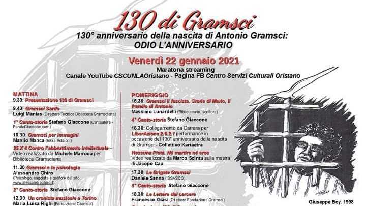 ORISTANO. A Oristano si celebra il 130esimo anniversario di Antonio Gramsci. Venerdì 22 gennaio, per l’occasione il Centro servizi culturali Unla di Oristano, la Biblioteca Gramsciana e la Nur, organizzano una maratona streaming. Dalle 9.30 fino alle 19.30 in programma otto dirette e altrettanti contributi video dedicati alla figura di Antonio Gramsci trasmessi sul canale Youtube CscunlaOristano e sulla pagina Facebook Centro servizi culturali Oristano.