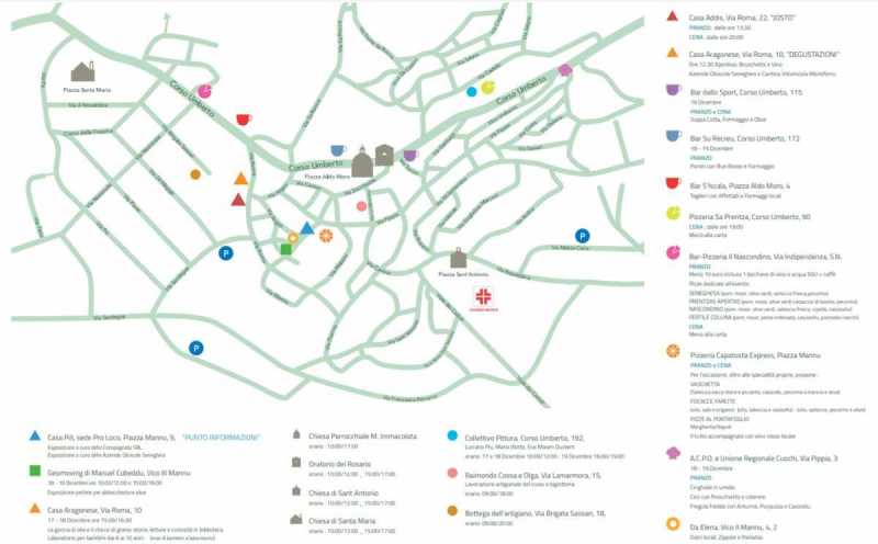 A disposizione dei visitatori ci sarà una mappa di Seneghe elaborata graficamente appositamente per orientarsi facilmente tra le location della manifestazione, con le indicazioni di tutti i luoghi deputati agli incontri, alle attività del percorso enogastronomico, degli artigiani, fino alle suggestive chiese storiche del paese.