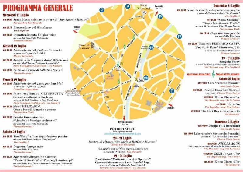 SAN SPERATE. Torna la sagra delle pesche a San Sperate, la manifestazione che dal 17 al 21 luglio permette ai turisti e ai curiosi di assaggiare il frutto più famoso del "paese museo". La festa, che avverrà in concomitanza alle celebrazioni del patrono San Sperate, il 17 luglio, sarà teatro di spettacoli, buon cibo (in particolare pesche) e musica per le strade del paese, in particolare via Cagliari e piazza Gramsci. Di seguito il programma completo della 58esima edizione.