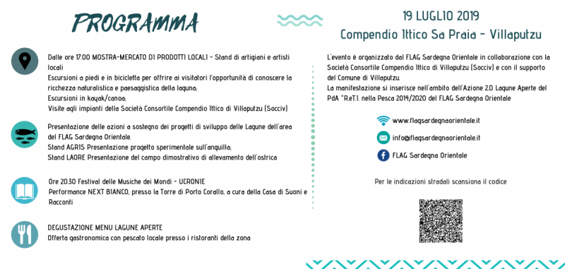 VILLAPUTZU. "Lagune Aperte", l'iniziativa di promozione del mestiere della pesca e del ruolo del pescatore, portata avanti dal Flag Sardegna orientale, si sposta per la prima volta nello stagno di Sa Praia a Villaputzu. La manifestazione, prevista per venerdì 19 luglio a partire dalle ore 17, si terrà nella sede della Società consortile del compendio ittico di Villaputzu (Socciv) ed è organizzata e gestita dalla stessa con il supporto del Flag Sardegna orientale e del comune di Villaputzu.