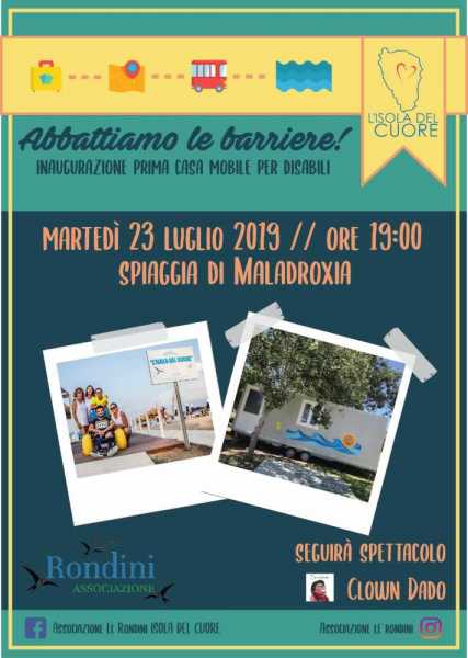 SANT'ANTIOCO. Nasce un nuovo servizio nello stabilimento balneare “Isola Del Cuore” di Maladroxia, dedicato ai pazienti gravi e gravissimi, progettato e realizzato dall’associazione di volontario onlus “Le Rondini”. Martedì 23 luglio, alle 19, verrà inaugurata la prima casa mobile per disabili, che verrà posizionata vicino allo stabilimento balneare e sarà attrezzata per consentire agli ospiti de “L’Isola Del Cuore” di trascorrere un’intera giornata in relax, grazie anche all’impegno dei soci volontari dell’associazione e alle figure specialiste coinvolte a titolo unicamente volontario. Dopo la cerimonia seguirà l’intrattenimento con lo spettacolo del “Clown Dado”.