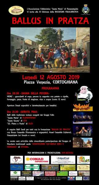 “Ballus in Pratza” si colloca nell’ambito del cartellone di eventi “Estiamoinsieme 2019”. La serata comincerà alle ore 20.30 con l’apertura degli stand espositivi, l’intrattenimento per bambini e la sagra della pecora, una cena a base di gnocchetti al sugo, pecora in cappotto con patate e cipolle, formaggio, pane, frutta di stagione, vino e acqua. Alle ore 21.30 al via la serata folkloristica con i balli della tradizione isolana eseguiti dai gruppi folk “Santa Maria” di Flumentepido, “Santa Giusta” di Uta, “SS. Pietro e Paolo” di Ales. A seguire sono previsti balli sardi coordinati dalla formazione “Ballus de Prazza” con Bruno Camedda (fisarmonica e organetto), Asael Camedda (chitarra), Gianmichele Lai (trunfa e voce). La serata sarà impreziosita dalla partecipazione del Gruppo di maschere tradizionali sarde “Associazione Culturale Boes e Merdules” di Ottana.