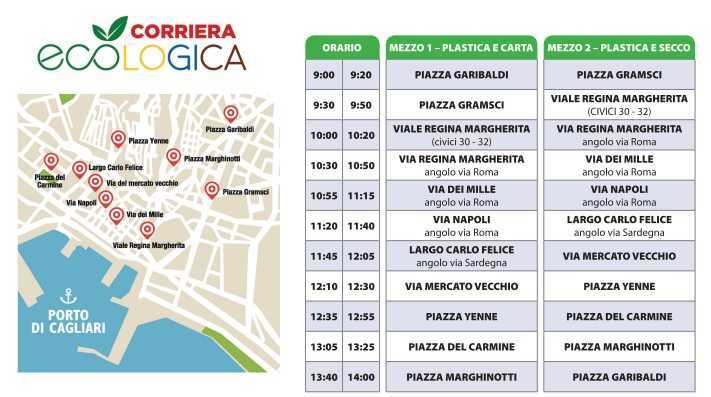 CAGLIARI. Partiranno lunedì 12 agosto i nuovi orari e le nuove fermate della Corriera ecologica, il mezzo che effettua soste di 20 minuti in postazioni e orari prestabiliti dove i commercianti si potranno recare per gettare la spazzatura. Servirà a garantire agli esercenti un servizio capillare in tutti i quartieri più centrali.