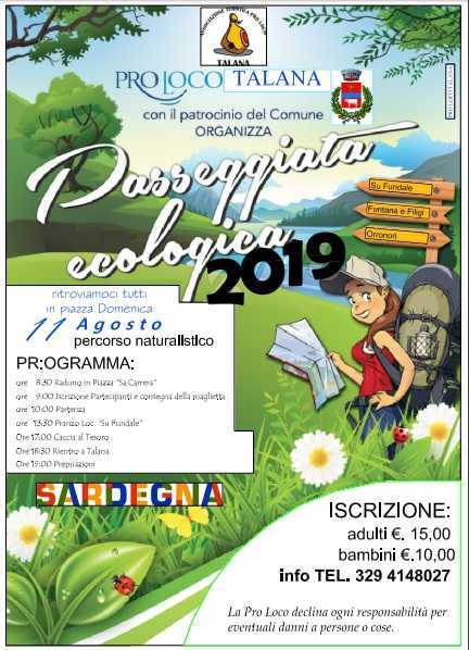 TALANA. Proseguono gli eventi promossi dalla pro loco di Talana. L’associazione turistica, presieduta da Claudio Murgia, organizza per domenica 11 agosto la "Passeggiata ecologica". L’appuntamento è per le 8,30 in piazza Sa Carrera dove si potranno effettuare le iscrizioni di partecipazione (la quota è di 15 euro per gli adulti e 10 per i bambini) e ritirare le maglie da indossare durante l’escursione.