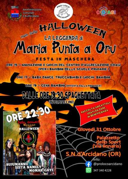SAN NICOLÒ ARCIDANO. la Proloco di San Nicolò Arcidano, (col patrocinio del Comune e la collaborazione della cooperativa Coagi) aggiunge al suo tradizionale calendario di eventi una nuova iniziativa: la festa di Halloween in maschera, una ricorrenza ormai tradizionale vista la recente diffusione anche al di fuori dei paesi anglosassoni. Ma non si mancherà però di celebrare per l'occasione anche una figura fantastica locale, quella di Maria Punta 'a Oru, la cui tradizione si sta perdendo ma che molti ricordano.