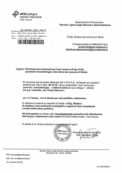 OLLOLAI. Vietato bere dal rubinetto o utilizzare l'acqua per cucinare. L'Arpas di Sassari ha analizzato i parametri microbiologici dell'acqua del rubinetto di piazza Marconi a Ollolai. I valori, risultati fuori dalla norma hanno reso necessaria una comunicazione urgente dall'Ats Sardegna al sindaco del paese per firmare il divieto a tutti i cittadini di utilizzare l'acqua per uso potabile e alimentare. "Il divieto - si legge nell'ordinanza firmata dal primo cittadino Efisio Arbau - permarrà fino a quando non si avranno dagli organismi competenti i risultati di successive analisi che attestino la conformità dell'acqua in distribuzione nella rete idrica di Ollolai, ai valori di parametro fissati dal Dlgs 31/2001".