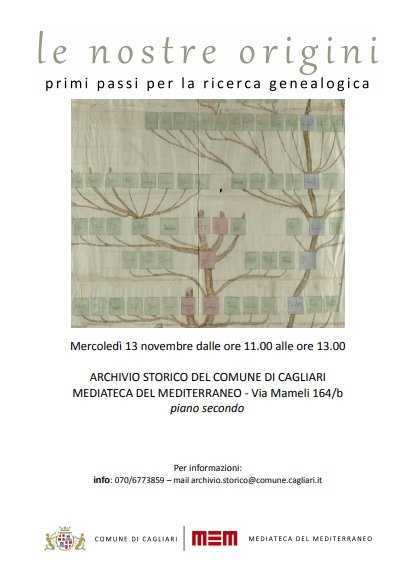 CAGLIARI. Lo Spazio eventi al secondo piano della Mem – Mediateca del mediterraneo di via Mameli 164 a Cagliari, ospiterà, mercoledì 13 novembre dalle 11 alle 13, un nuovo appuntamento con il laboratorio “Le nostre origini: primi passi per la ricerca genealogica”.