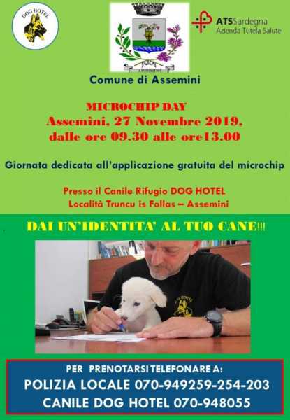 ASSEMINI. Nuovo appuntamento mercoledì 27 novembre al canile "Dog hotel" di Assemini , in località Truncu Is Follas, per l'inserimento gratuito del microchip ai cani non ancora iscritti all'anagrafe canina.