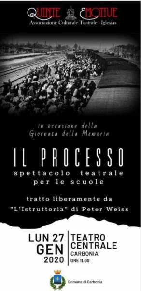 CARBONIA. Lunedì 27 gennaio il comune di Carbonia celebra la “Giornata della Memoria” e la commemorazione delle vittime dell’olocausto con l’organizzazione di uno spettacolo a cura dell’associazione culturale teatrale “Quinte emotive”, che si svolgerà alle ore 11 al teatro Centrale. L’evento è destinato agli studenti delle scuole secondarie di secondo grado, a tutti i cittadini interessati, e si prefigge “l’obiettivo di ricordare le vittime delle persecuzioni nazifasciste e del genocidio ebraico, sensibilizzando nel contempo i ragazzi verso i valori della libertà, della pace, della giustizia e dell'integrazione”, ha commentato il sindaco Paola Massidda.