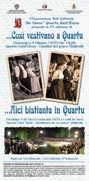 QUARTU. Il Covid non ferma la voglia di rispettare e riscoprire la tradizione di Quartu e dei quartesi: anche quest’anno l’associazione Folk Culturale Su Idanu, con il patrocinio del Comune, organizza la sfilata espositiva ‘Così vestivano a Quartu - Aici bistianta in Quartu’, giunta alla XV edizione. L’evento è in programma domenica 4 ottobre alle 19 nei giardini del parco Matteotti.