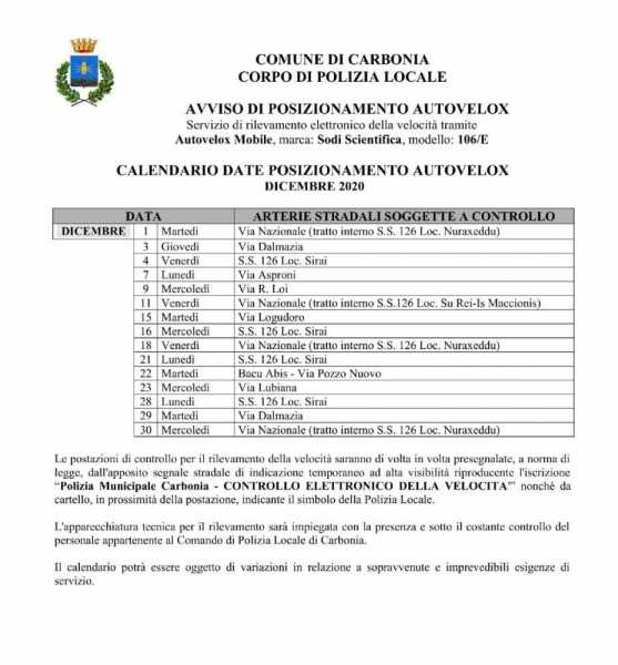 CARBONIA. La Polizia Locale di Carbonia effettuerà nel corso dei mesi di Novembre e Dicembre 2020 controlli sistematici su tutto il territorio comunale per verificare che siano rispettati i limiti di velocità da parte dei conducenti.