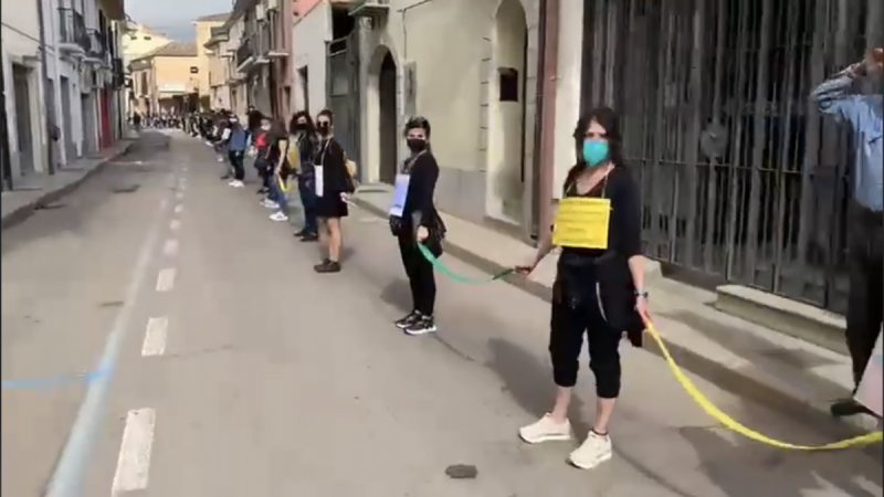 Legati simbolicamente a un filo che li tiene uniti chiedono di ripartire in sicurezza.