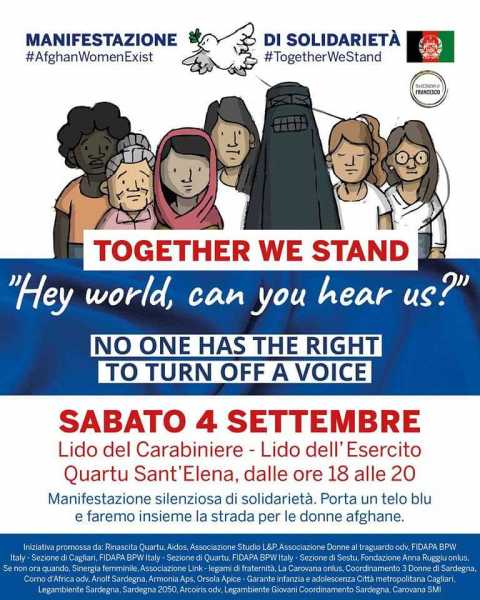 Il Comune di Quartu aderisce così alla manifestazione silenziosa di solidarietà "Together we Stand- Po is feminas de s'Afghanistan" nata da un'iniziativa di Economy of Francesco e promossa in città dall'associazione Rinascita con la partecipazione di 21 sigle associative fra cui Aidos, Associazione Studio L&P, Donne al traguardo, Fidapa, Coordinamento 3, Associazione Link-Legami di fraternità, Arcoiris e tante altre.