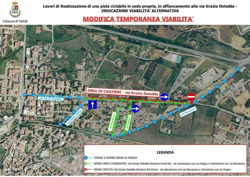 TORTOLì.  Al via da oggi i lavori per la realizzazione di una pista ciclopedonale in via Grazia Deledda. Per permettere lo svolgimento in sicurezza dei lavori è stata disposta dal comando di polizia locale una specifica ordinanza che regola il traffico nel tratto di strada interessato tra via Angius e via Baccasara con la seguente modalità:
