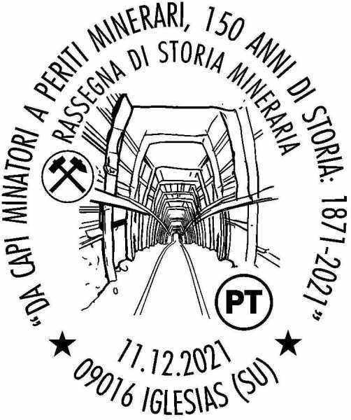 IGLESIAS. In occasione della “Rassegna di Storia Mineraria”, Poste Italiane attiverà sabato 11 dicembre, un servizio postale temporaneo con bollo speciale con la dicitura “Rassegna di Storia Mineraria – Da capi minatori a periti minerari, 150 anni di storia: 1871 - 2021”.
