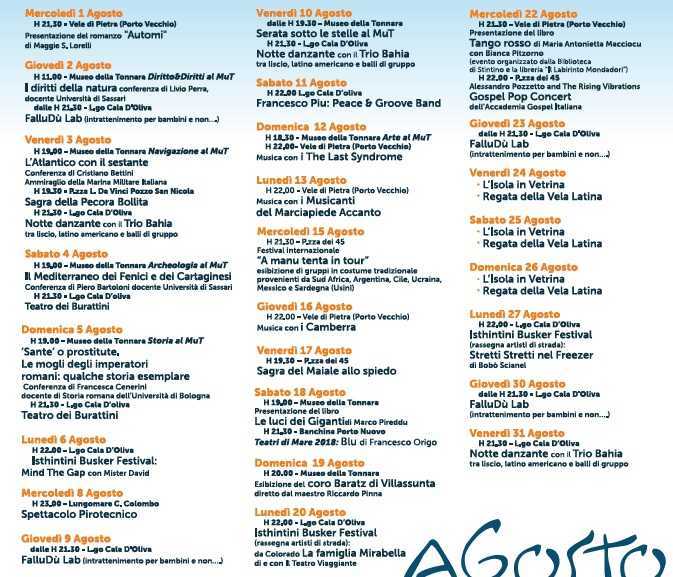 Il 18 agosto, alle 21,30, sarà la volta del Teatro di Mare 2018, uno spettacolo teatrale che si svolgerà a bordo di un veliero attraccato alla banchina del Porto Mannu. Anteprima il 17 per le vie del paese.