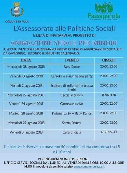 PULA. Al via il progetto di baby-sitting serale comunale, la nuova iniziativa del Comune di Pula che tiene conto delle esigenze dei genitori che non possono contare sui nonni o una baby-sitter. Il progetto, organizzato dall’assessorato alle Politiche sociali e giovanili e rivolto ai bambini tra i 5 e 10 anni, parte l’8 agosto ed è completamente gratuito. Per 8 sere, dalle 20 alle 22, un team di educatori esperti intratterrà i più piccoli con giochi e attività ludico-ricreative: baby dance, karaoke, caccia al tesoro, pigiama party e tanto altro!