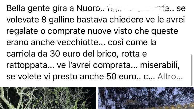 NUORO. “Se volevate 8 galline bastava chiedere ve le avrei regalate o comprate nuove visto che queste erano anche vecchiotte”. È la denuncia pubblicata sul gruppo Facebook “Sei di Nuoro se” dalla vittima del furto. Oltre alle galline sarebbe stata portata via anche una carriola “da 30 euro del Brico, rotta e rattoppata... ve l’avrei comprata... miserabili, se volete vi presto anche 50 euro.. cosa speravate di trovare in un pollaio di legno? Che nascondessi dei soldi li?". Si legge sul post.