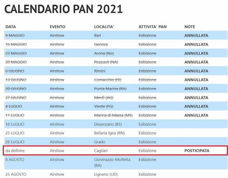 CAGLIARI. È stata rinviata a data da destinarsi l'esibizione delle Frecce Tricolori a Cagliari. Il calendario della pattuglia acrobatica nazionale prevedeva un air show completo per il primo agosto. Ma è lunga la serie di cancellazioni che sta interessando gli aerei che tingono i cieli di verde-bianco-rosso, dopo evoluzioni spettacolari. Annullate tutte le tappe che erano state fissate fino al 18 luglio. E se restano confermate quelle successive, compare un "posticipata" per l'esibizione nel Golfo degli Angeli.