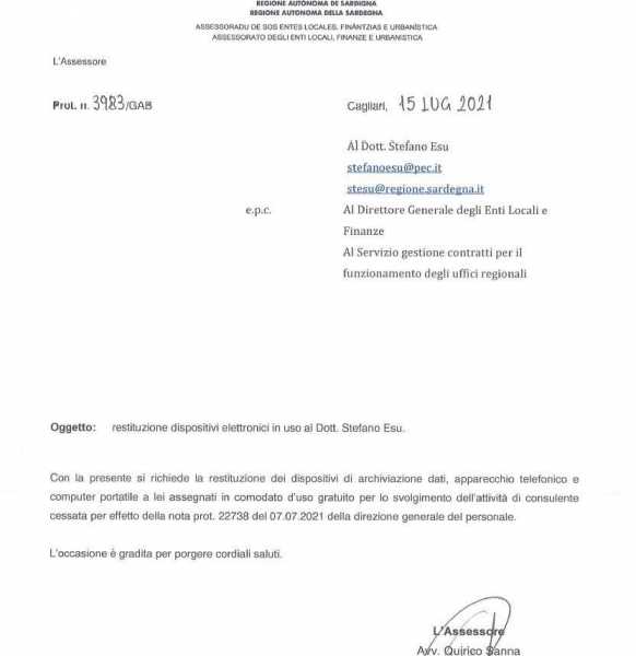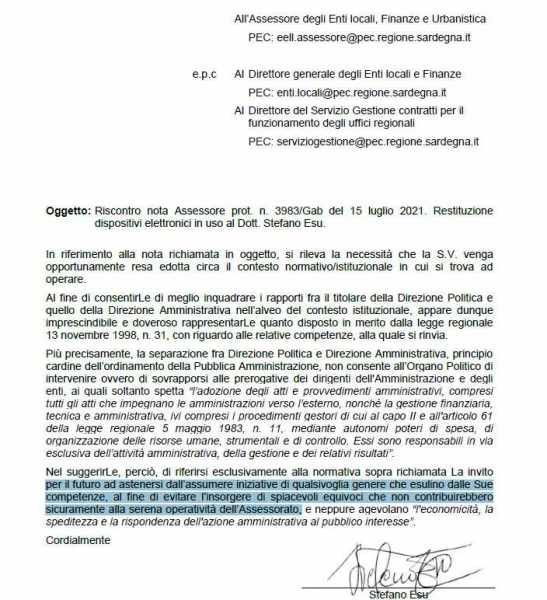 Solo che Stefano Esu ha risposto. Dimostrando di non aver gradito la nota dell'assessore. Richiamando la separazione tra competenza della parte politica e quella della parte amministrativa dell'apparato regionale, ha invitato Sanna "per il futuro ad astenersi dall’assumere iniziative di qualsivoglia genere che esulino dalle Sue competenze, al fine di evitare l’insorgere di spiacevoli equivoci che non contribuirebbero sicuramente alla serena operatività dell’assessorato".