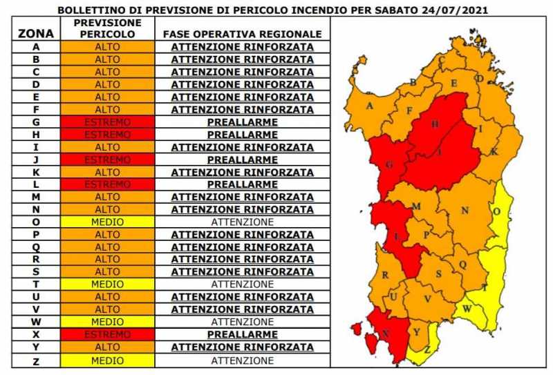 Sale fino al livello di preallarme, per rischio estremo, la soglia di allerta per il versante occidentale del Sulcis, l'Oristanese, il Marghine, la Planargia, il Montiferru e il Monte Acuto. In fascia arancione tutto il resto dell'Isola, salvo il Sulcis sul versante cagliaritano e la fascia costiera sud orientale, fino all'Ogliastra.