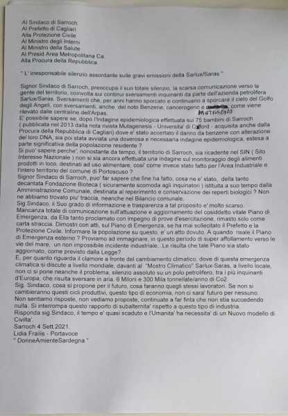 "Signor sindaco di Sarroch, preoccupa il suo totale silenzio, la scarsa comunicazione verso la gente del territorio, coinvolta sui continui sversamenti inquinanti da parte dell'azienda petrolifera Sarlux/Saras", ha attaccato la Frailis, "Sversamenti che, per anni hanno sporcato e continuano il cielo del Golfo degli Angeli, sversamenti, anche del noto Benzene, come viene rilevato dalle centraline dell'Arpas, cancerogeno e mutageno".