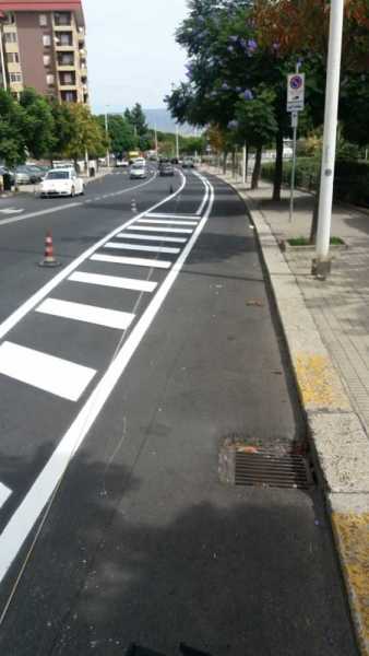 Erano rimasti dei cartelli, che sembravano indicare l'imminenza del tracciamento della segnaletica orizzontale . Ma niente. Fino a oggi: le strisce bianche sono comparse. Su entrambi i lati della carreggiata.