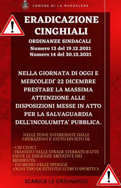 LA MADDALENA. Parte l'eradicazione dei cinghiali a La Maddalena e scattano le restrizioni: vietate le passeggiate nelle strade sterrate e gli accessi nelle spiagge, sospese tutte le attività ludico sportive. Lo annuncia il sindaco Fabio Lai con un avviso alla cittadinanza, in cui chiedere di "prestare la massima attenzione per i primi due giorni di operazioni". "Questa sera e mercoledì 22 dicembre", si legge, "verranno effettuate le prime operazioni di eradicazione della specie ibrida. Secondo quanto disposto dal piano approvato dal Parco Nazionale Arcipelago di La Maddalena è prevista una sospensione per il periodo delle festività e la ripresa alla fine delle stesse, pertanto prestare la massima attenzione per questi primi due giorni di operazioni".