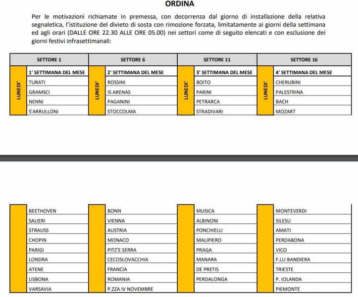 "Tali divieti entreranno in vigore dalla data di installazione della relativa segnaletica, limitatamente ai giorni della settimana e agli orari interessati, ovvero dalle ore 22.30 alle ore 05.00, con esclusione dei festivi infrasettimanali".