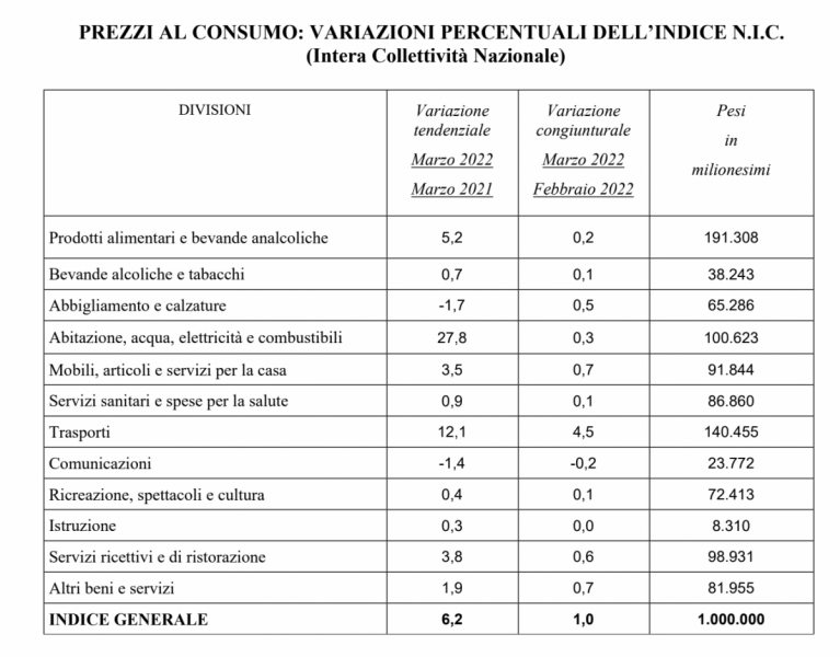 "Nel mese di marzo 2022", si legge, "l’indice dei prezzi al consumo per l’intera collettività, per la parte congiunturale, ha segnato una variazione del +1,0%, in aumento rispetto al +0,8% registrato nel mese precedente. L’indice tendenziale registra una variazione del +6,2%, risultando così in aumento anche esso