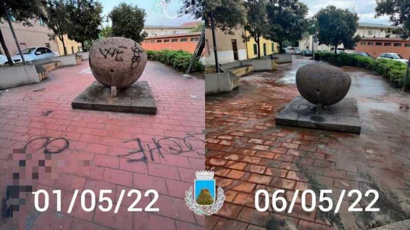 "L’amministrazione comunale è prontamente intervenuta per ripulire le scritte e i disegni volgari presenti nella piazza e nel monumento, che ricordiamo avere un’importanza rilevante in quanto opera di uno dei più grandi artisti sardi.