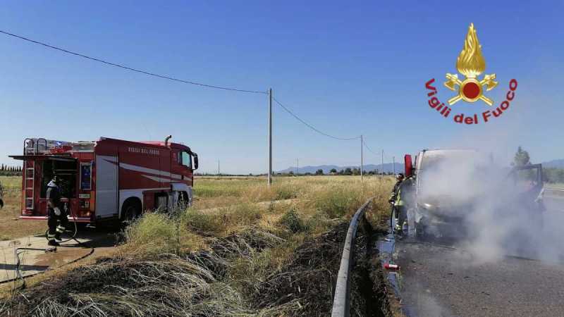 SESTU. Un furgone in transito ha preso fuoco, questa mattina intorno alle 10,30, sulla Strada Provinciale 2 tre Sestu e Assemini, all'altezza del km 2.400.