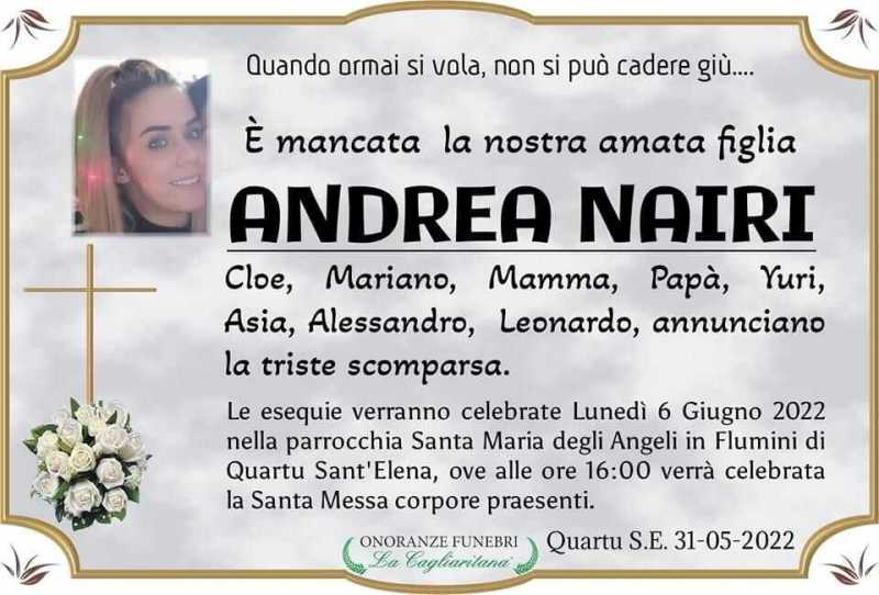 QUARTU. Si svolgerà oggi il funerale di Andrea Nairi, la giovane mamma di 27 anni tragicamente scomparsa all'improvviso martedì scorso nella sua casa di Flumini, a Quartu (QUI LA NOTIZIA).