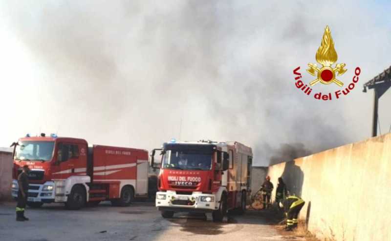 Gli operatori stanno operando per spegnere le fiamme che hanno coinvolto anche l'area esterna perimetrale dove erano depositate attrezzature agricole e materiali vari.