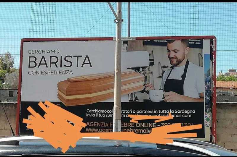CAGLIARI. Un lavoro che non va mai in crisi. Un luogo comune che capita di sentire spesso quando si parla di agenzie funebri. Evidentemente, visto l'annuncio più unico che raro presente in un cartellone pubblicitario in via Is Mirrionis a Cagliari, i clienti all'azienda in questione non mancano affatto. E infatti cercano "baristi" con esperienza: non per servire caffè e cappuccini ma per occuparsi di bare e servizi connessi. L'immagine e l'annuncio sicuramente colpiscono. Chissà se l'ironia in stile Taffo funzionerà per trovare nuovo personale.