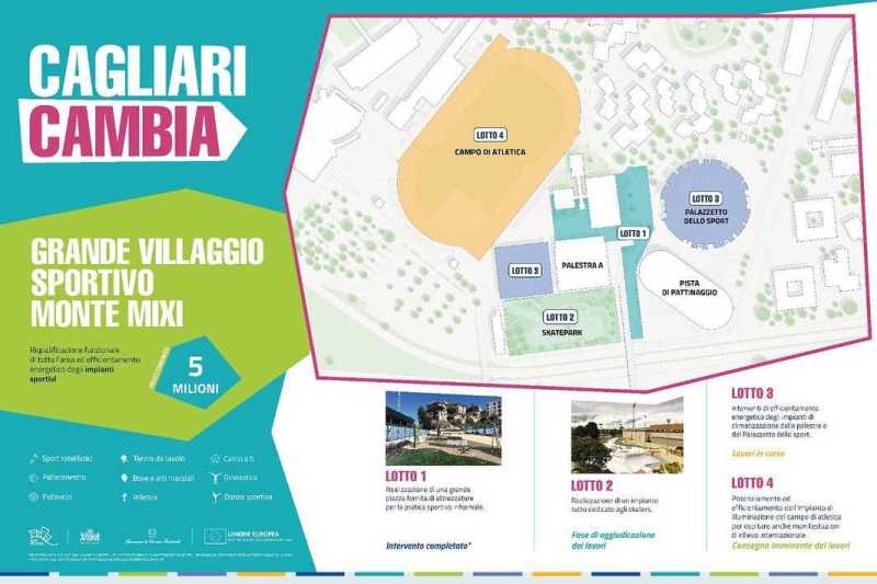 “La nascita del Grande Villaggio Sportivo, in un quartiere caro ai cagliaritani per le gesta sportive del passato ha importanti ricadute sociali - dice Truzzu -. Lanciamo un messaggio alle associazioni, alle famiglie e al movimento dello sport di base, confermando l’attività fisica come uno dei pilastri su cui si fonda la buona qualità della vita a Cagliari”. Testimonial dell’intervento di riqualificazione del Grande Villaggio Sportivo è l’atleta azzurra Dalia Kaddari: “Sono molto felice per la realizzazione di questo progetto che punta a restituire alla città di Cagliari un’area di grandissimo valore. Sono ancora più felice per gli interventi previsti nel campo di atletica, il campo dove mi alleno quotidianamente. È uno stimolo per avvicinare allo sport, e in particolare all’atletica, tanti giovani che finalmente potranno avere un impianto che potrà ospitare anche manifestazioni di rilievo internazionale”. L'area è divisa a metà dalla via degli Sport e comprende diversi impianti sportivi di primaria importanza quali: Il Palazzetto dello Sport Il Pattinodromo L’Impianto sportivo di atletica leggera "Riccardo Santoru" Le palestre A e B Il Palaboxe Lo skatepark L'intervento si sviluppa in quattro lotti: Il lotto 1 prevede la realizzazione di una grande piazza sportiva nel tratto terminale di via degli Sport fino alla via Pessagno tra gli spazi pertinenziali degli impianti sportivi di Monte Mixi. Lo scopo è quello di realizzare luogo di incontro attrezzato che funga da cerniera per tutti gli impianti presenti nell’area, dotato di percorsi pedonali e ciclabili, spazi verdi con panchine, fontanelle e attrezzature sportive e di un nuovo impianto di illuminazione pubblica, capace di accogliere gli utenti e di incrementare la flessibilità d’uso dello spazio. Il lotto 2 prevede la realizzazione di un nuovo skatepark destinato alla pratica degli sport rotellistici, in sostituzione del campo di calcio dietro le palestre A e B. L’intervento nasce dalla necessità di dotare la città di una struttura moderna e innovativa, adeguata alle esigenze della sempre crescente comunità di giovani praticanti la disciplina dello skateboard, inserendola in un contesto ad alta vocazione sportiva. Il lotto 3 prevede l’adeguamento funzionale delle Palestre A, destinata al calcetto e altre discipline, e Palestra B, destinata alla pallavolo e alla ginnastica artistica, e del Palazzetto dello Sport attraverso il rifacimento totale degli impianti di condizionamento estivo ed invernale, assicurando il rispetto dei Criteri Ambientali Minimi. L’intervento nasce infatti dalla volontà di attuare un considerevole risparmio energetico, adottando soluzioni tecniche con l’impiego di apparecchiature innovative e di ultima generazione in grado di consentire cospicui risparmi energetici.
