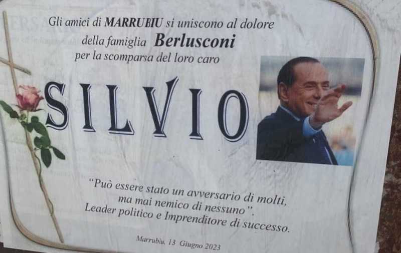 ORISTANO. Tre pagine di necrologi sul Corriere della Sera, centinaia di messaggi di cordoglio arrivati dal mondo politico ma anche un singolare saluto che arriva dall'Oristanese. A Marrubiu nei cartelloni posizionati in strada che di solito accolgono i necrologi dei defunti della comunità, ne è comparso uno per l'ex leader di Forza Italia. "Può essere stato un avversario di molti, ma mai nemico di nessuno. Leader politico e imprenditore di successo". Firmato: "gli amici di Marrubiu"