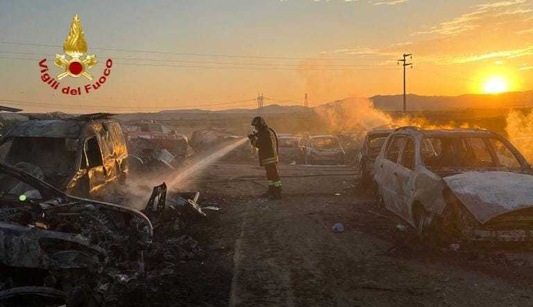 SESTU. Un grosso rogo è scoppiato durante la notte a Sestu. Un deposito abusivo per la demolizione delle auto è stato distrutto dalle fiamme lungo la provinciale 9. Il rogo è scoppiato verso le 4 e le fiamme hanno bruciato almeno 50 carcasse d'auto parcheggiate nel terreno. Sono intervenuti sul posto i vigili del fuoco del comando provinciale di Cagliari con due autobotti e un fuoristrada dotato di modulo antincendio boschivo.