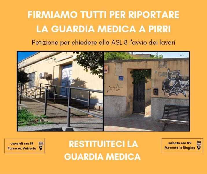 CAGLIARI. La coalizione di centrosinistra della Municipalità di Pirri organizza una petizione per chiedere all'Asl 8 di iniziare i lavori di riqualificazione nello stabile della Guardia medica in via Santa Maria Chiara e riportarla nel territorio pirrese.