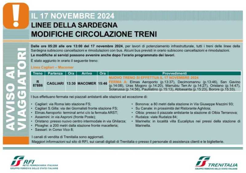 CAGLIARI. Domenica 17 novembre, la circolazione ferroviaria in Sardegna sarà interrotta dalla mezzanotte (primo treno alle 5.20 cancellato) alle 13 per consentire importanti lavori programmati da Rfi (Rete Ferroviaria Italiana). Per garantire la continuità dei collegamenti, Trenitalia ha predisposto autobus sostitutivi.