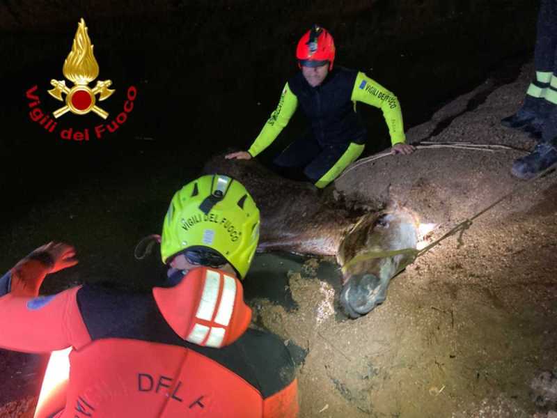 I vigili del fuoco hanno raggiunto l’animale, che si trovava all’interno dell’acqua, lo hanno imbragarto e, con l’ausilio della gru in dotazione al Comando, hanno lo hanno sollevato riportandolo sulla terra ferma.