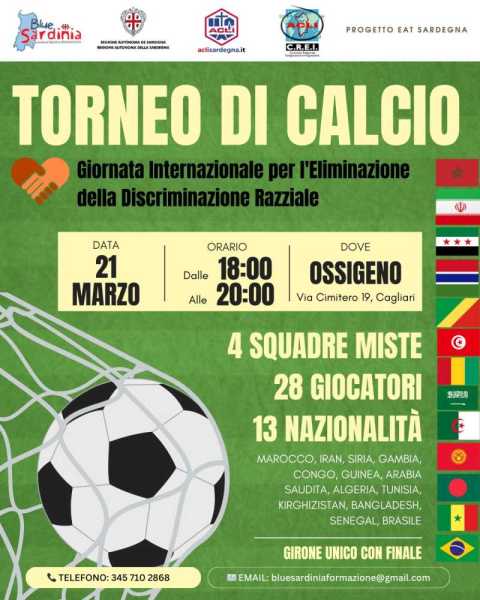 CAGLIARI. Il calcio come strumento di inclusione e lotta contro la discriminazione. È questo lo spirito del torneo che si terrà a Cagliari il 21 marzo, in occasione della Giornata Internazionale per l'Eliminazione della Discriminazione Razziale. L’evento, organizzato da Blue Sardinia asd in collaborazione con Acli Sardegna e Crei, si svolgerà dalle 18:00 alle 20:00 presso Ossigeno, in via Cimitero 19, con il sostegno della Regione Sardegna.