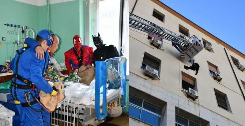 Grazie all’intervento del reparto Saf (Speleo Alpino Fluviale) e alla gru autoscala, i vigili del fuoco mascherati da supereroi della DC Comics e della Marvel, Batman e Superman, si sono calati dalle finestre della biblioteca della Pediatria, diretta dal dottor Gianfranco Meloni, portando sacchi colmi di uova preparate dall’associazione “Gianni Fresu”. Poco dopo, Spiderman e Captain America hanno raggiunto i colleghi‑eroi, suscitando stupore e sorrisi. Nel reparto di Neuropsichiatria Infantile, diretto dal professor Stefano Sotgiu, i quattro vigili del fuoco mascherati si sono calati dal tetto per fare "irruzione" in punta di piedi!