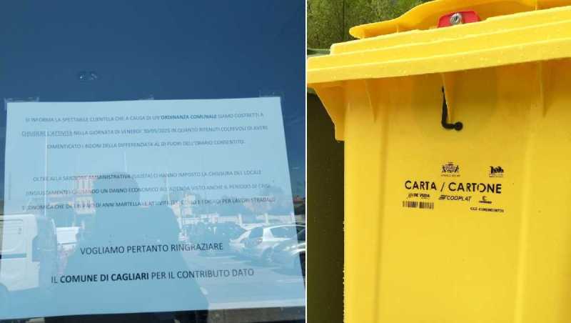 CAGLIARI. "Si informa la spettabile clientela che, a causa di un’ordinanza comunale, siamo costretti a chiudere l’attività nella giornata di oggi in quanto ritenuti colpevoli di avere dimenticato i bidoni della differenziata al di fuori dell’orario consentito". Questo recita il cartello affisso fuori dal bar Loyal che si affaccia su viale Marconi a Cagliari. Un provvedimento che risalirebbe addirittura a febbraio secondo i gestori del locale e che si sommerebbe ad una sanzione amministrativa.