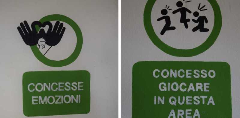 L'intervento di Manu Invisible, curato dal partner Exmè & Affini Onlus, ha sovvertito l'assunto generale per cui tra le mura di un carcere vige la costrizione. Con la tecnica degli stencil ha creato una serie di messaggi che aprono, invece, alla concessione: concesse emozioni, concesso giocare in quest'area, concesse effusioni, concesso accarezzarsi, concesso mangiare, concedere il contatto. “Capovolgere il messaggio è l'essenza della street art e questo lavoro è pienamente coerente con ciò che porto avanti ormai da anni - chiarisce l'artista, che poi prosegue – l’uso del colore, in questo contesto, diventa una forma di gioia tangibile, un modo per infondere calore e speranza in un ambiente che altrimenti potrebbe risultare opprimente”.