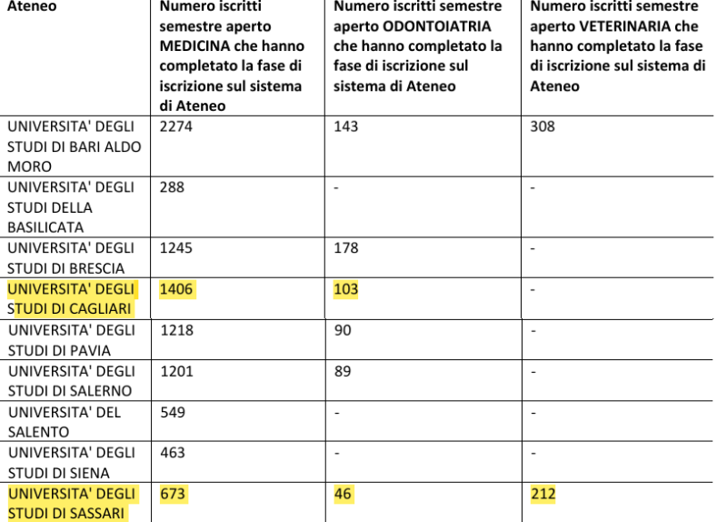 CAGLIARI. Venerdì 25 luglio si sono chiuse le iscrizioni al semestre filtro per le facoltà di Medicina e chirurgia, Veterinaria e Odontoiatria. A Cagliari sono in totale 1509 (1406 in Medicina e chirurgia e 103 in Odontoiatria) gli iscritti, mentre a Sassari 673 per Medicina e chirurgia, 46 per Odontoiatria e 212 per Medicina veterinaria.