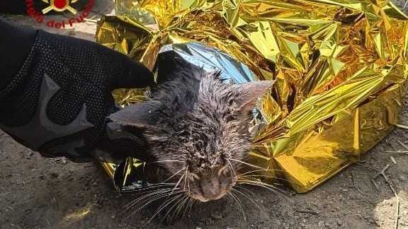 SAN SPERATE. Era caduta in un vascone d'acqua dove era rimasto intrappolato e rischiava di affogare. A intervenire i vigili del fuoco che hanno recuperato il micio stamattina nella campagne di San Sperate.
